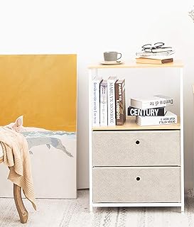 Suhu Commode Meuble de Rangement avec 2 Tiroir 1 étagères Table de Chevet Table de Nuit Petite Table Basse Metallique pour Salon Armoire Livre Chambre Tissus Pieds Réglables Bois+Acier Blanche+Beige