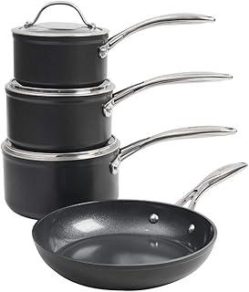 ProCook Professional Ceramic - Batterie de Cuisine Induction - Série 4 Pièces - Revêtement Céramique & Titane - Casseroles & Poêle - Couvercles Verre Trempé - Poignées INOX Isolant