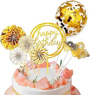 WELLXUNK® Gâteau Anniversaire Décoration Cake Topper, Or gâteau Anniversaire Confettis Ballon feu Artifice Décor, pour Or Thème Fête Décoration, Les décorations de fête de Mariage d'anniversaire